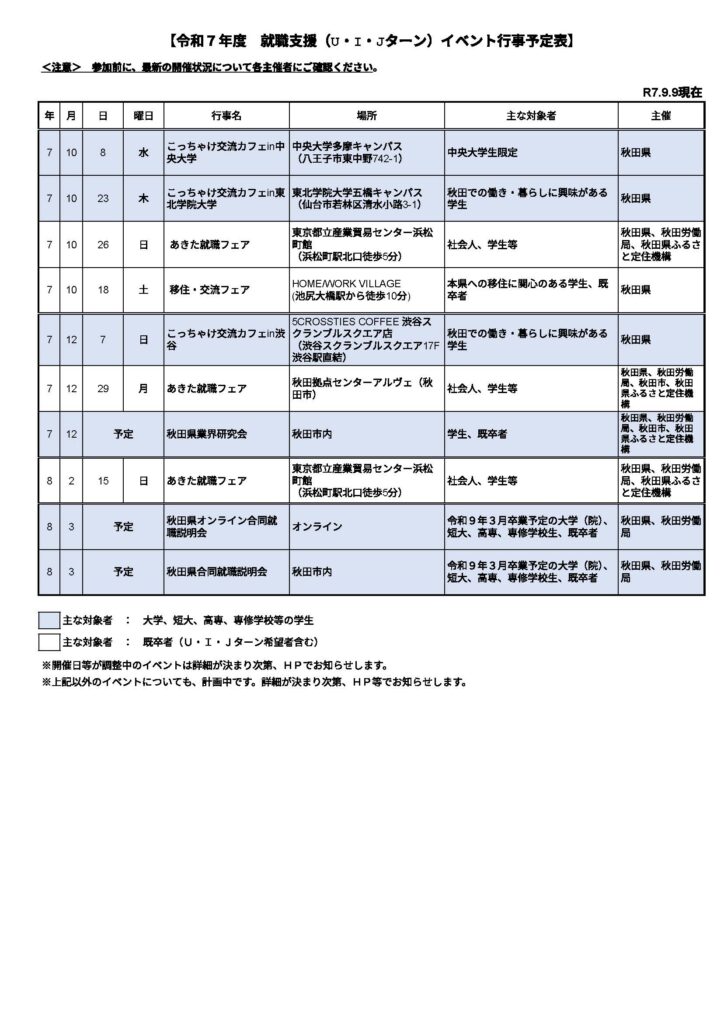 令和7年度 就職⽀援(U‧I‧Jターン)イベント⾏事予定表をご参照ください。