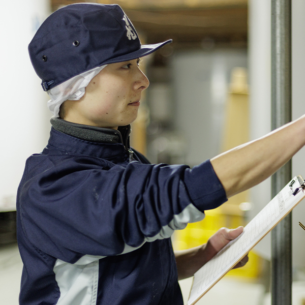 製造課長の長江です。入社して7年になります。もともと地元出身で、日本酒が好きだったこともあり、日の丸醸造に入社しました。今は製造部門の責任者として、酒造りの現場をまとめています。
